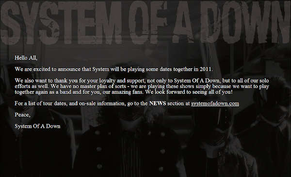O rock e a música estão mais felizes, o SYSTEM OF A DOWN depois de 5 anos de hiato e muitas especulações finalmente anuncia o seu retorno.